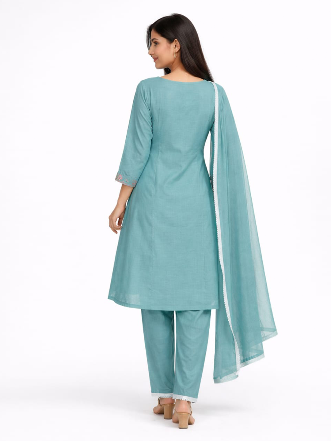 This teal blue kurta set is perfect for everyday wear. The top features colorful floral embroidery on the neckline and sleeves, adding a bright touch to the solid color. It comes with matching comfortable pants and a lightweight dupatta finished with a delicate white lace border.